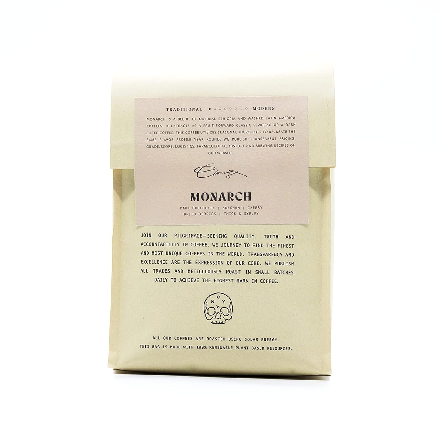 Monarch is Onyx's most developed roast and conveys a flavor profile intentionally designed to work well with milk. Cream and plant based beverages mix with ease, creating a rich, decadent flavor. It involves a natural, sugar-dense coffee that binds to the fats and creates multiple complex caramelized notes during the roasting process. Look for dark chocolate and undertones of thick winey berries. Awesome as drip or espresso.